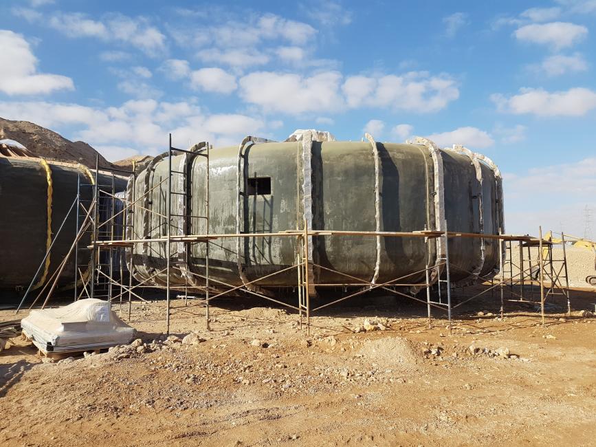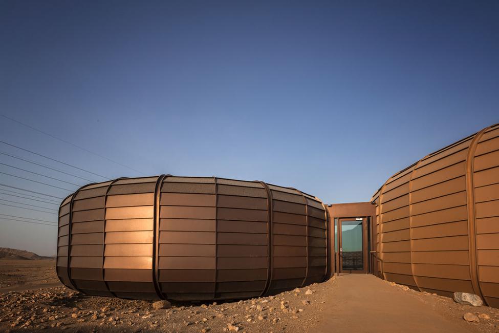 The pods are clad in steel panels, colored to reference the different hues of the surrounding landscape as well as to shade the precast concrete structures.